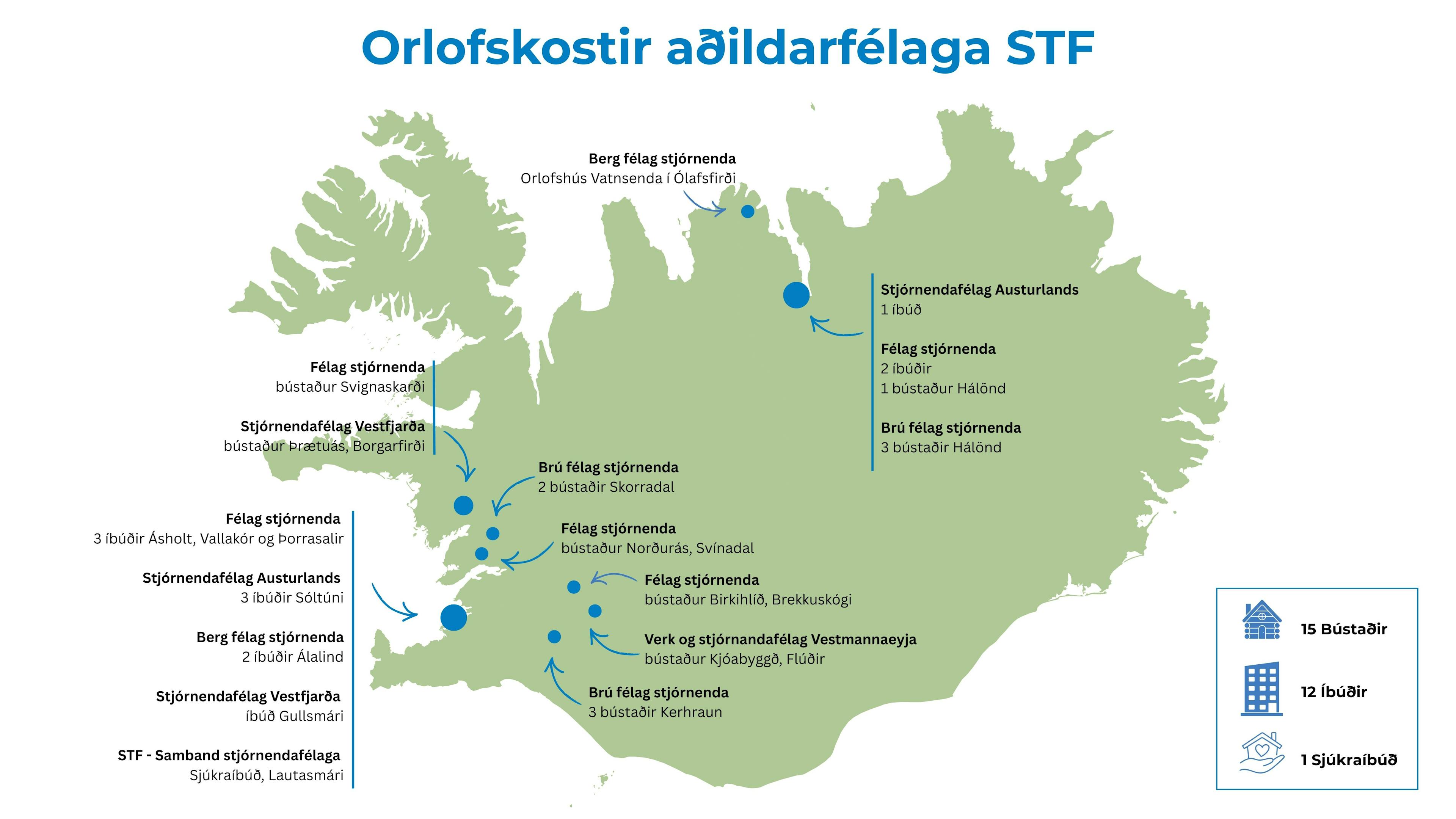 Stjórnendafélögin bjóða félagsfólki upp á 15 bústaði, 12 íbúðir og 1 sjúkraíbúð víðs vegar um landið. Orlofskostirnir eru í útleigu allan ársins hring og henta því jafnt yfir vetur, vor, sumar og haust – ekki bara í sumarleyfinu.